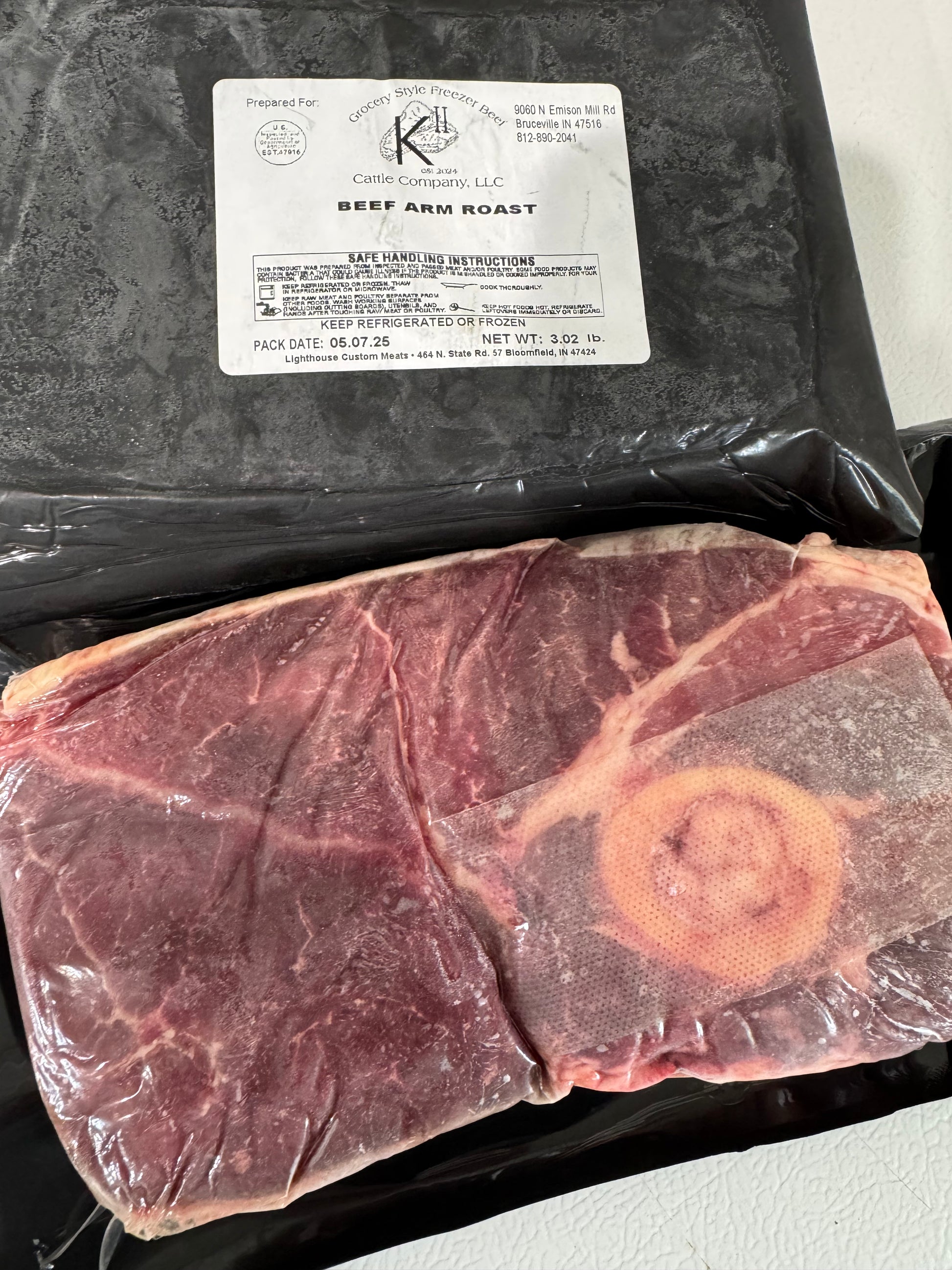 Arm roast that come from the shoulder of a beef. Price is a set price based on the average weight of inventory. Weight of packages range from 2.62 pounds to 3.7 pounds