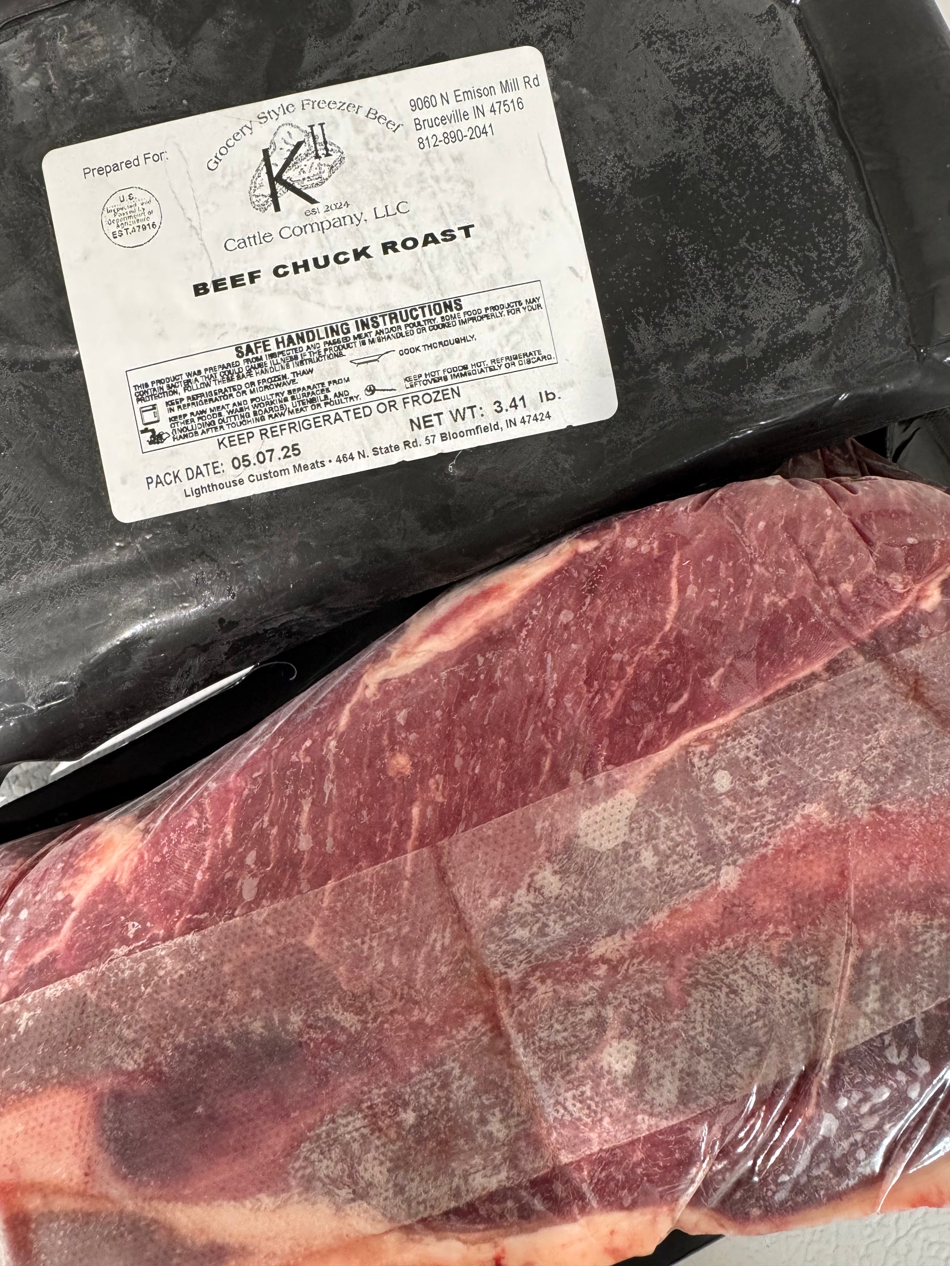 Chuck roast that comes from the chuck section or front shoulders of a beef. Price is a set price based on the average weight of inventory. Weight of packages range from 2.6 pounds to 4.96 pounds